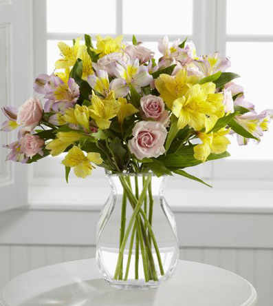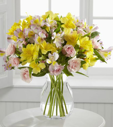 Breathtaking Beauty Bouquet. Bursting with beauty, this bouquet offers sunny sophistication with bright yellow Peruvian lilies blended with pale pink spray roses and pink Peruvian lilies to create a bouquet bursting with sweetness. This bouquet arrives pre arranged, to be placed directly into the included vase ( If Purchased ) . Just add water.