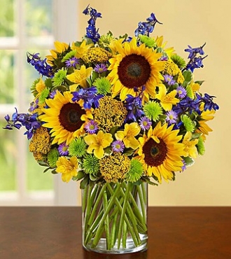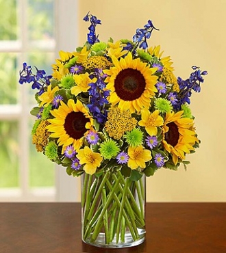 Turn heads with this beautiful, bright arrangement! This best selling arrangement features vibrant sunflowers, delphinium, alstroemeria and more! Same day local florist delivery available. * Vase sold separately. *