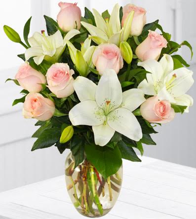This elegant pink and white bouquet will thrill that special person! The Pink Cloud bouquet features beautiful pink roses and white lilies accented with vibrant greenery arranged in a beautiful glass vase.