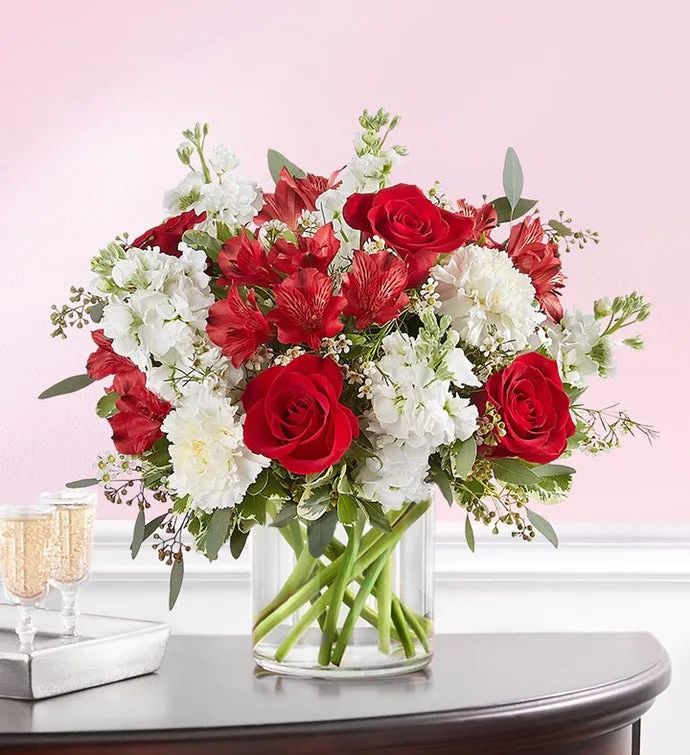 A classic gift for the people and moments worth celebrating. Rich red and pristine white blooms are hand-gathered with lush greenery. A clear glass cylinder vase holds this beautiful surprise, which brings your deepest sentiments to light. Designed by a Flowers Canada Florist