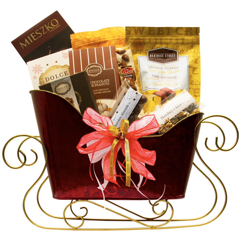 Just hear those sleigh bells jingle-ing ring ting tingle-ing too. Come on, it's lovely weather for a sleigh ride together with you. Our Sleigh Time basket is bound to bring someone Christmas cheer. This basket is filled with a generous supply of gourmet treats from our quality vendors like Dolce Chocolate, Miezko, Beatrice Street, Tina’s Gourmet Popcorn and so many more.