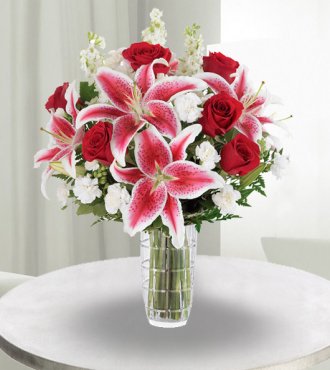 Let someone know you love them with this beautiful arrangement with stargazer lilies, red roses, and carnations This bouquet arrives pre arranged, to be placed directly into the included vase (if purchased). Just add water.
